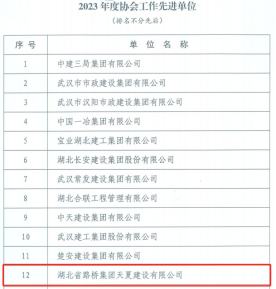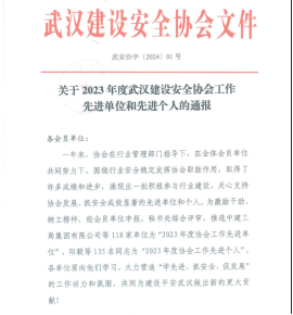 初心如磐守安全,砥礪奮進譜新篇。近日,武漢建設安全協會就2023年建筑行業安全生產方面評選了一批先進單位和先進個人,湖北路橋天夏公司榮獲“2023年度協會工作先進單位”稱號,天夏公司副總經理殷玉華、安全總監付建國榮獲“2023年度協會工作先進個人”稱號。