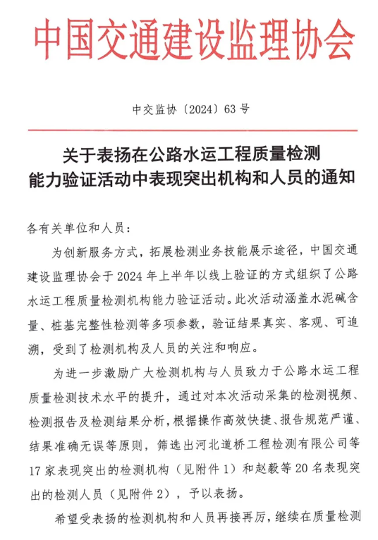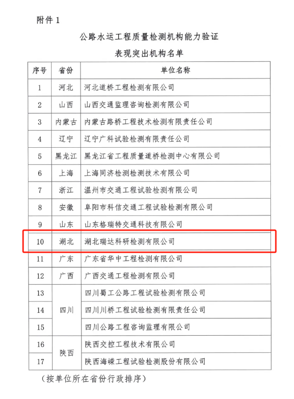近日,中國交通建設(shè)監(jiān)理協(xié)會發(fā)布《關(guān)于表揚在公路水運工程質(zhì)量檢測能力驗證活動中表現(xiàn)突出機構(gòu)和人員的通知》,湖北路橋旗下的瑞達(dá)檢測公司榮獲“表現(xiàn)突出機構(gòu)”稱號,且是湖北省內(nèi)唯一獲得表彰的檢測單位。